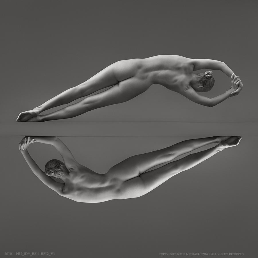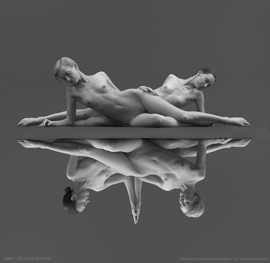 Originally started in the darkroom as overlay of negatives, the Reflections series came to a full realization with the advent of the digital workflow. Like other sculptural nude series by the artist, it is executed in the silky rich-tone black-and-white style. The participating pieces come from various Ezra’s series – from Women Beautiful, Horizontal Nudes and Triangles to the more recent Levitation. In that, Reflections offers a viewer a different, parallel perspective at the artist’s existing body of work.